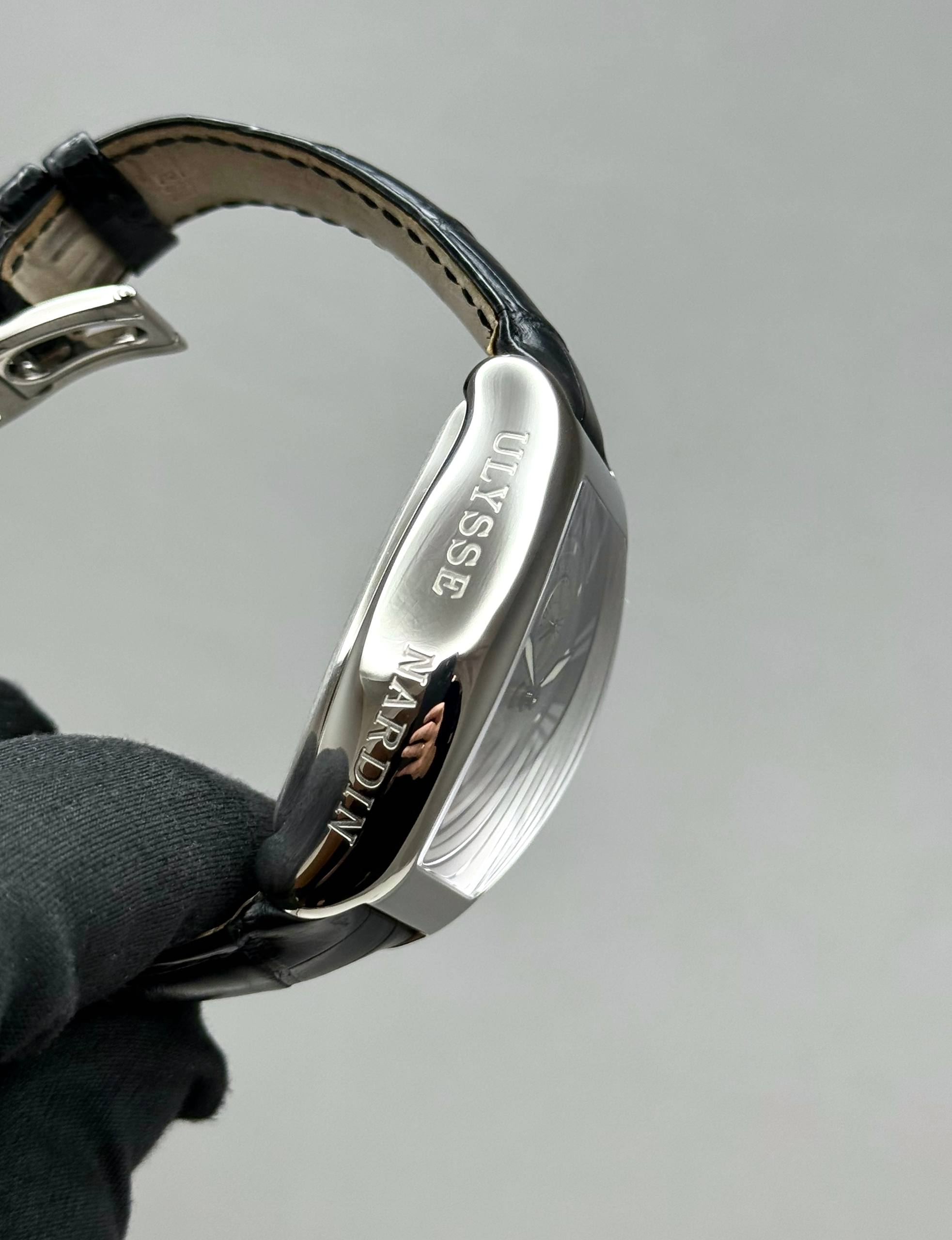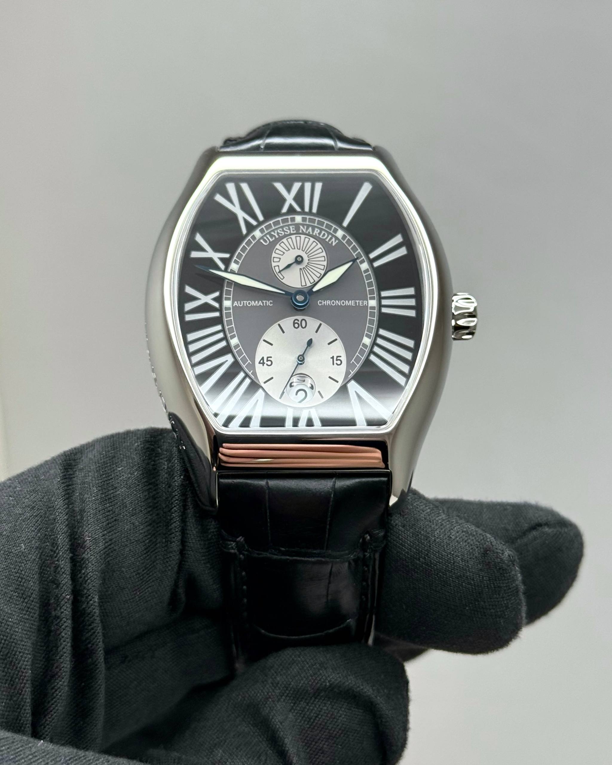 Бренд: Ulysse Nardin; Кому: Мужские; Состояние: С пробегом; Механизм: Механика с автоподзаводом; Ремешок: Кожа; Материал: Сталь; Стекло: Сапфировое; Форма: Бочка; Застежка: Раскладывающаяся; Материал застежки: Сталь; Комплектация: Переноска; Водонепроницаемость : 50 м; Запас хода: 42 ч; Калибр: UN-27; Страна: Швейцария; Циферблат: Черный; Размер корпуса: 38 x 43 мм; Функции: Дата, часы, минуты, секунды, индикатор запаса хода;