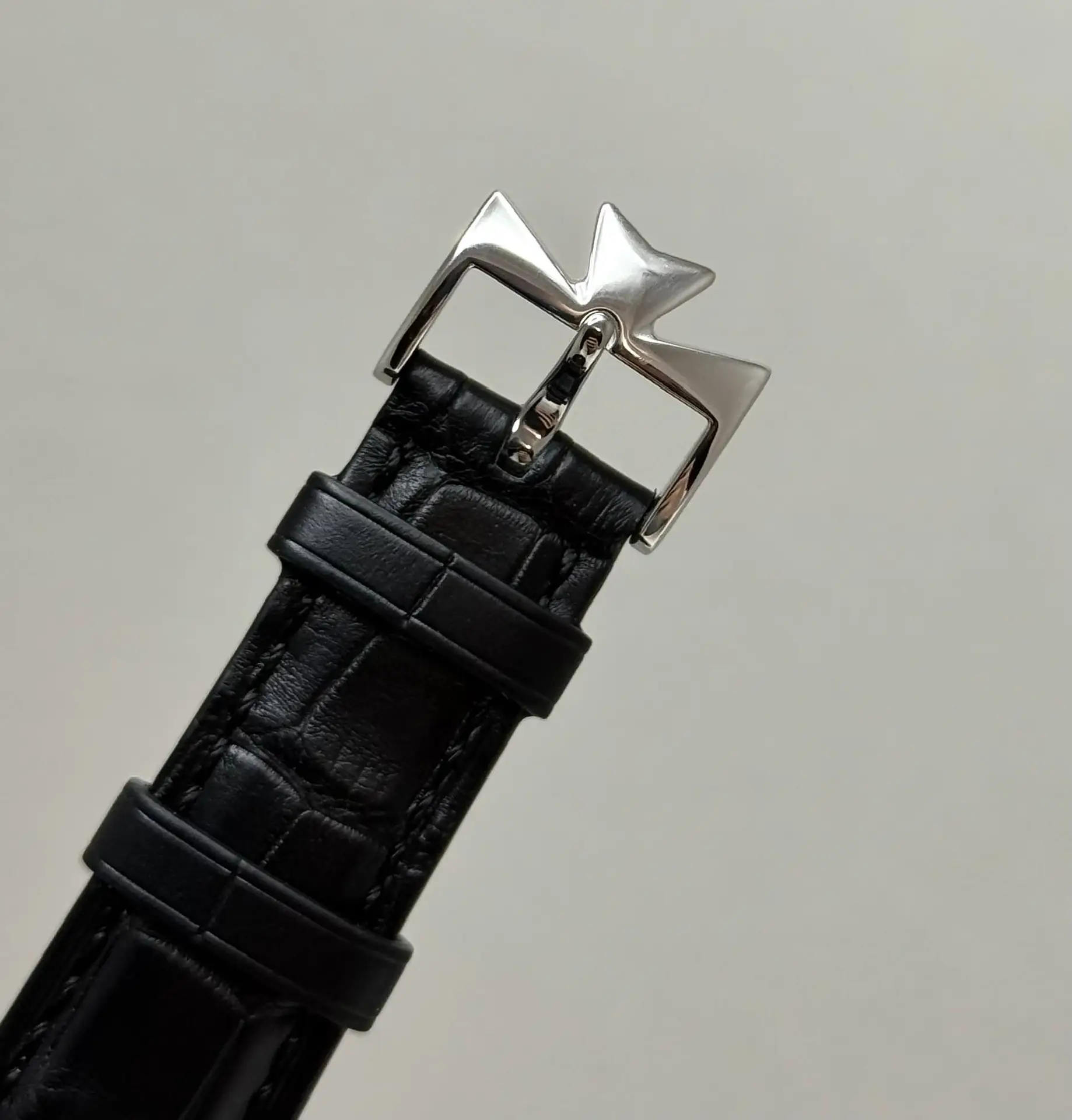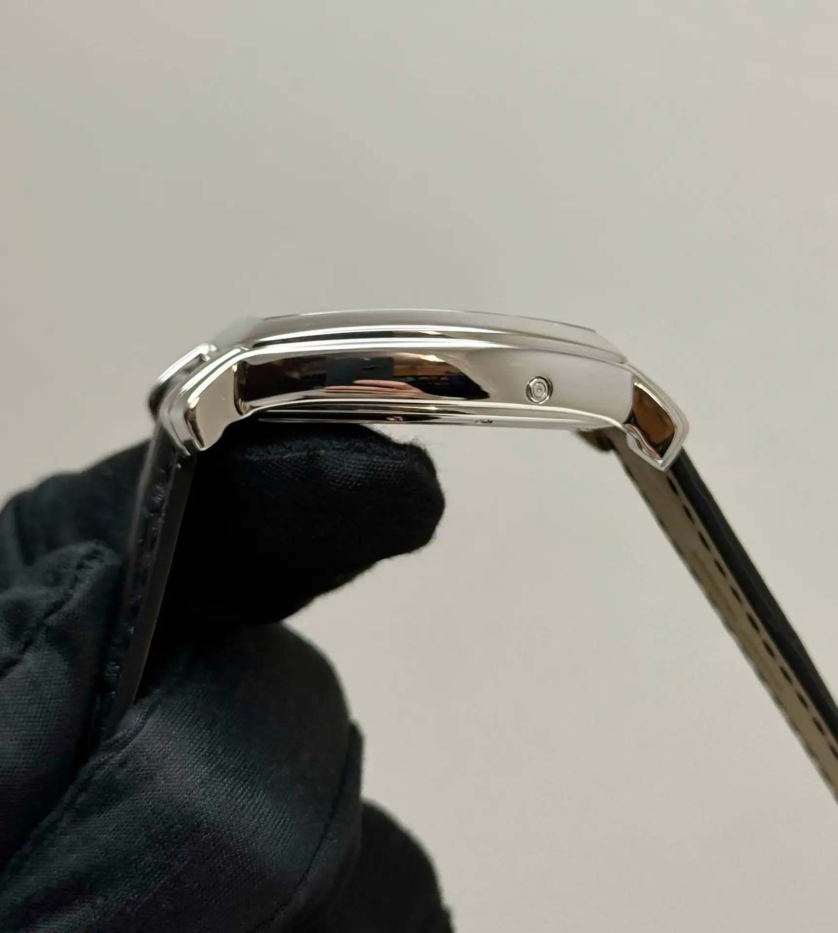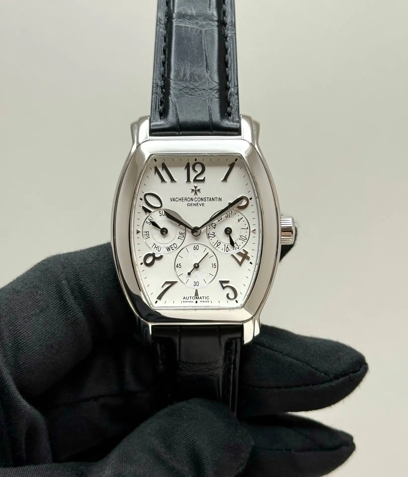 Бренд: Vacheron Constantin; Кому: Мужские; Состояние: С пробегом; Механизм: Механика с автоподзаводом; Ремешок: Кожа; Материал: Белое золото; Стекло: Сапфировое; Форма: Бочка; Застежка: Пряжка; Материал застежки: Белое золото; Комплектация: Переноска; Вес: 103.3 гр; Водонепроницаемость : 50 м; Страна: Швейцария; Цвет ремешка: Черный; Циферблат: Белый; Размер ремня: 20.5 см; Размер корпуса: 35.5 х 49 мм; Функции: Дата, часы, минуты, секунды, день недели;