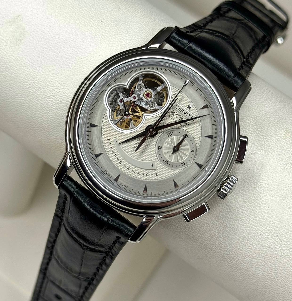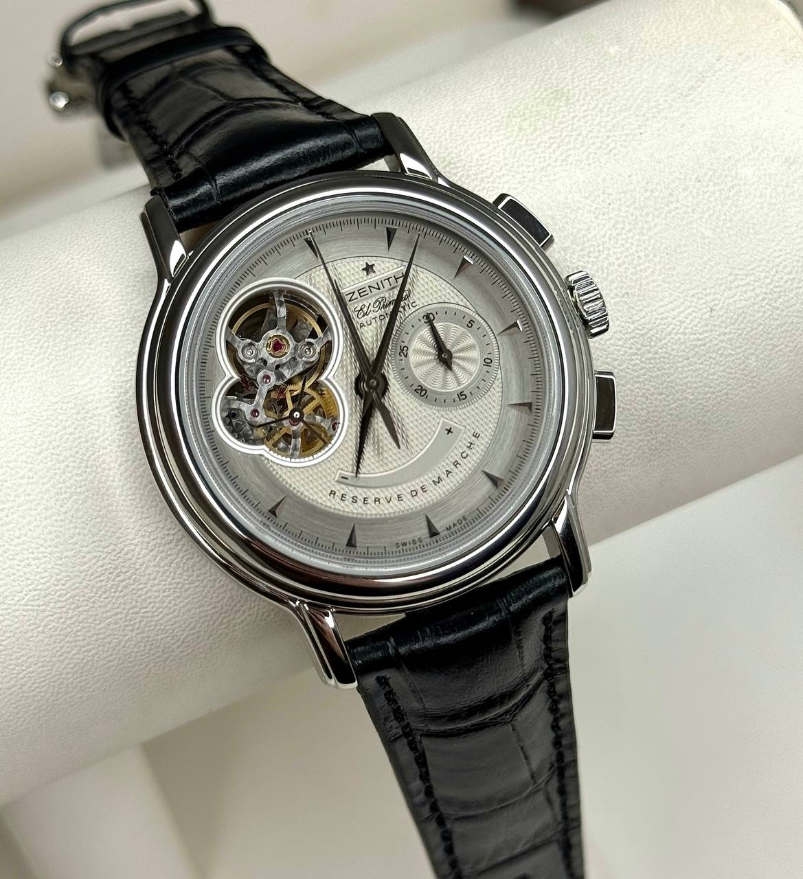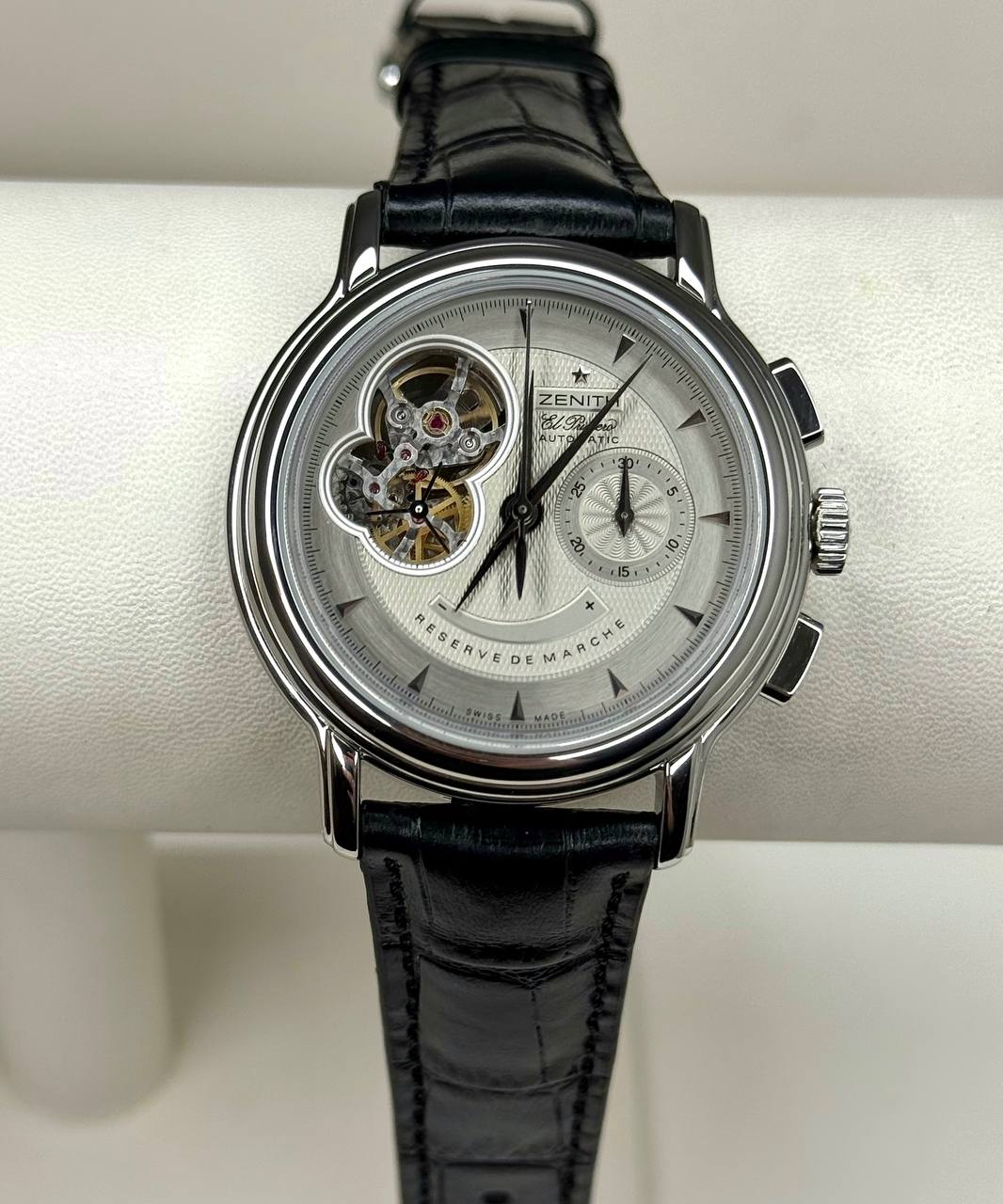 Бренд: Zenith; Кому: Мужские; Состояние: Как новые; Механизм: Механика с автоподзаводом; Ремешок: Кожа; Материал: Сталь; Стекло: Сапфировое; Форма: Круг; Застежка: Раскладывающаяся; Материал застежки: Сталь; Комплектация: Переноска; Водонепроницаемость : 30 м; Запас хода: 50 ч; Калибр: EL РRIMЕRO 4021; Страна: Швейцария; Циферблат: Серебристый скелетонизированный; Размер ремня: 23 см; Размер корпуса: 40 мм; Функции: Часы, минуты, секунды, хронограф, индикатор запаса хода;