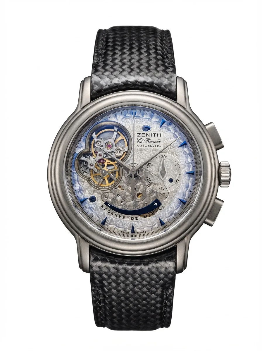 Бренд: Zenith; Кому: Мужские; Состояние: Как новые; Механизм: Механика с автоподзаводом; Ремешок: Кожа; Материал: Титан; Стекло: Сапфировое; Форма: Круг; Застежка: Раскладывающаяся; Материал застежки: Титан; Комплектация: Переноска; Водонепроницаемость : 30 м; Запас хода: 55ч; Страна: Швейцария; Циферблат: Серый скелетонизированный; Размер корпуса: 40 мм; Функции: Часы, минуты, секунды, хронограф, индикатор запаса хода;