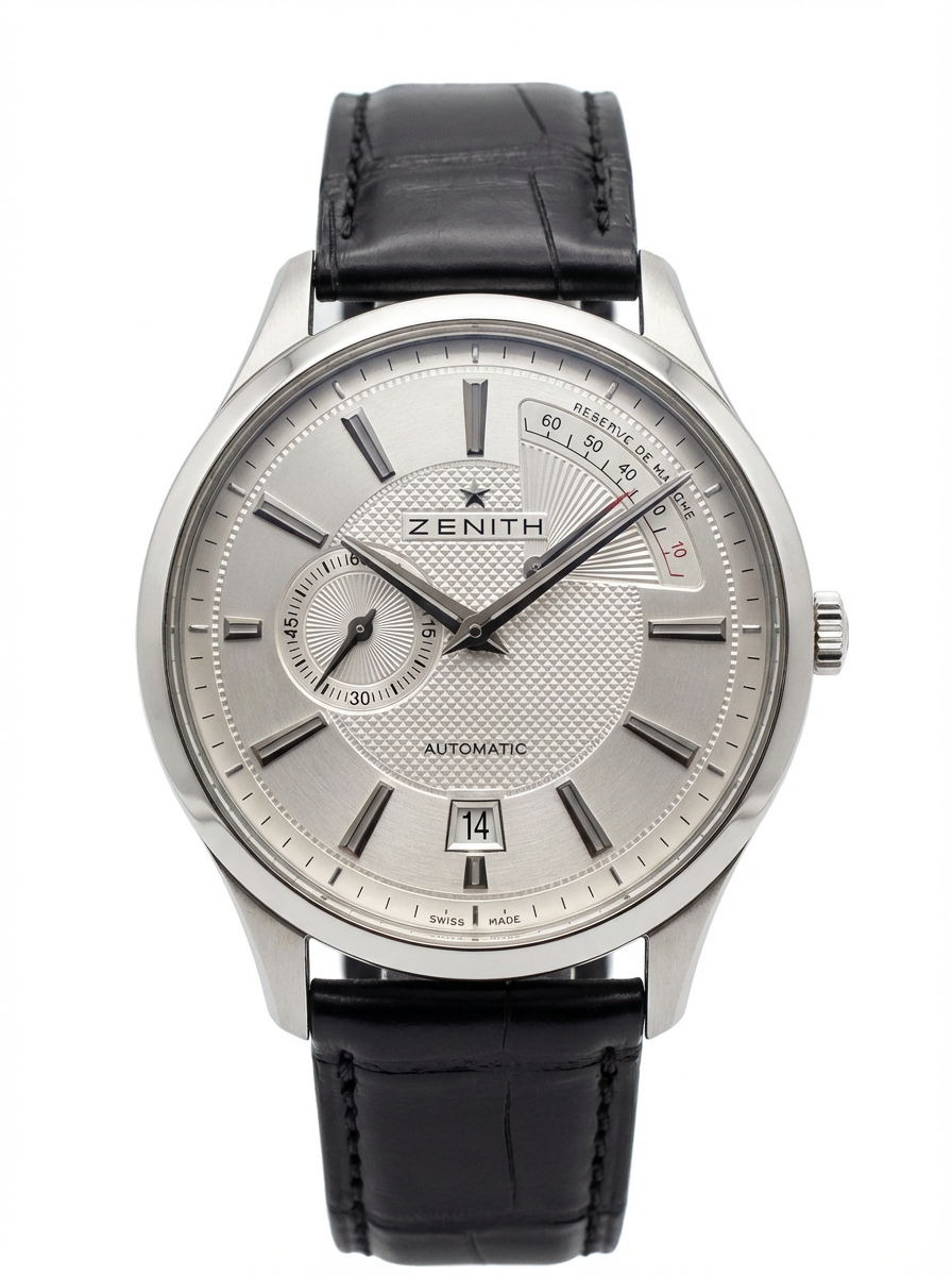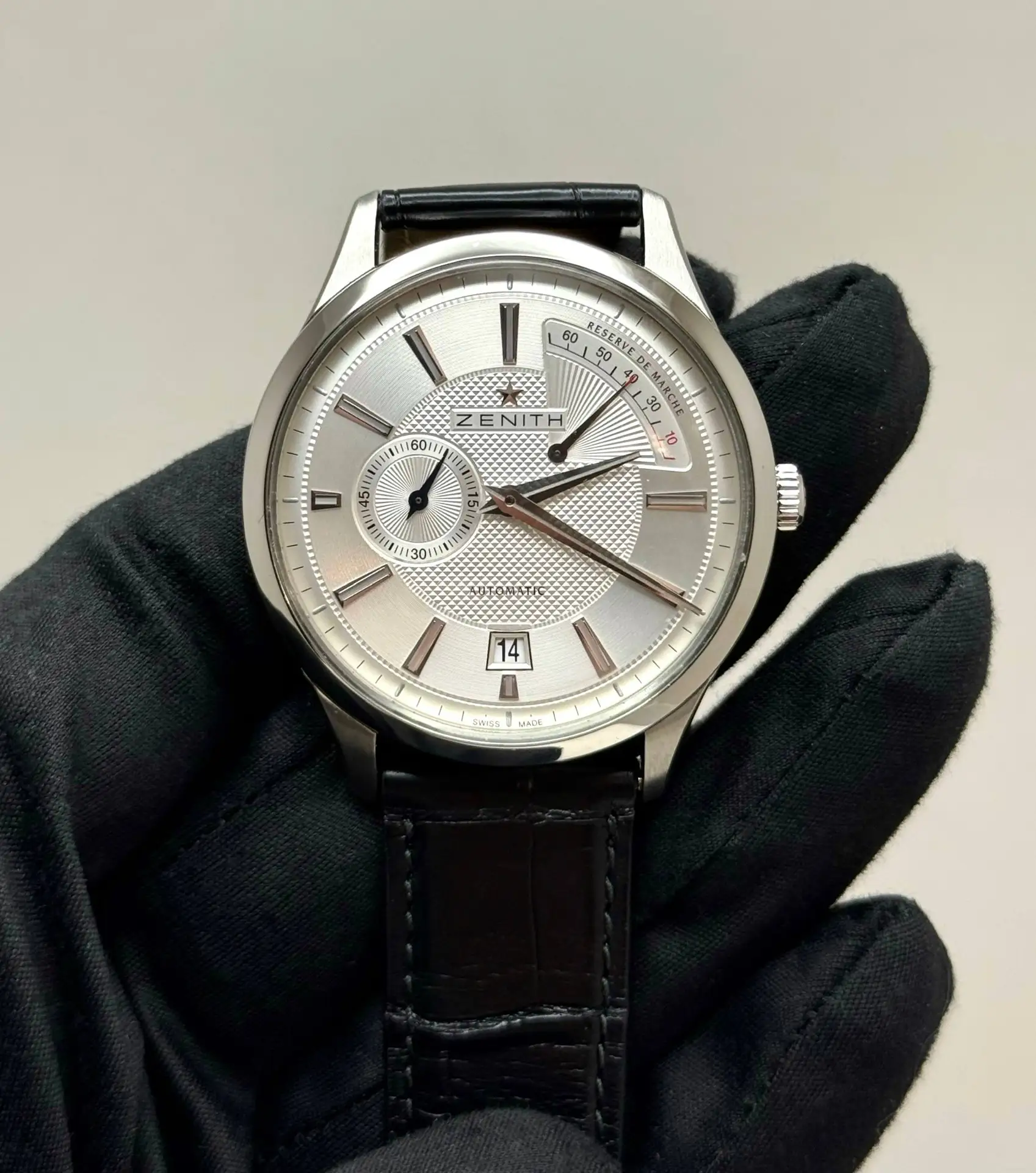 Бренд: Zenith; Кому: Мужские; Состояние: Как новые; Механизм: Механика с автоподзаводом; Ремешок: Кожа; Материал: Сталь; Стекло: Сапфировое; Форма: Круг; Застежка: Пряжка; Материал застежки: Сталь; Комплектация: Переноска; Водонепроницаемость : 50 м; Запас хода: 60 ч; Страна: Швейцария; Циферблат: Серый; Размер ремня: 20 см; Размер корпуса: 40 мм; Функции: Дата, часы, минуты, секунды, индикатор запаса хода;
