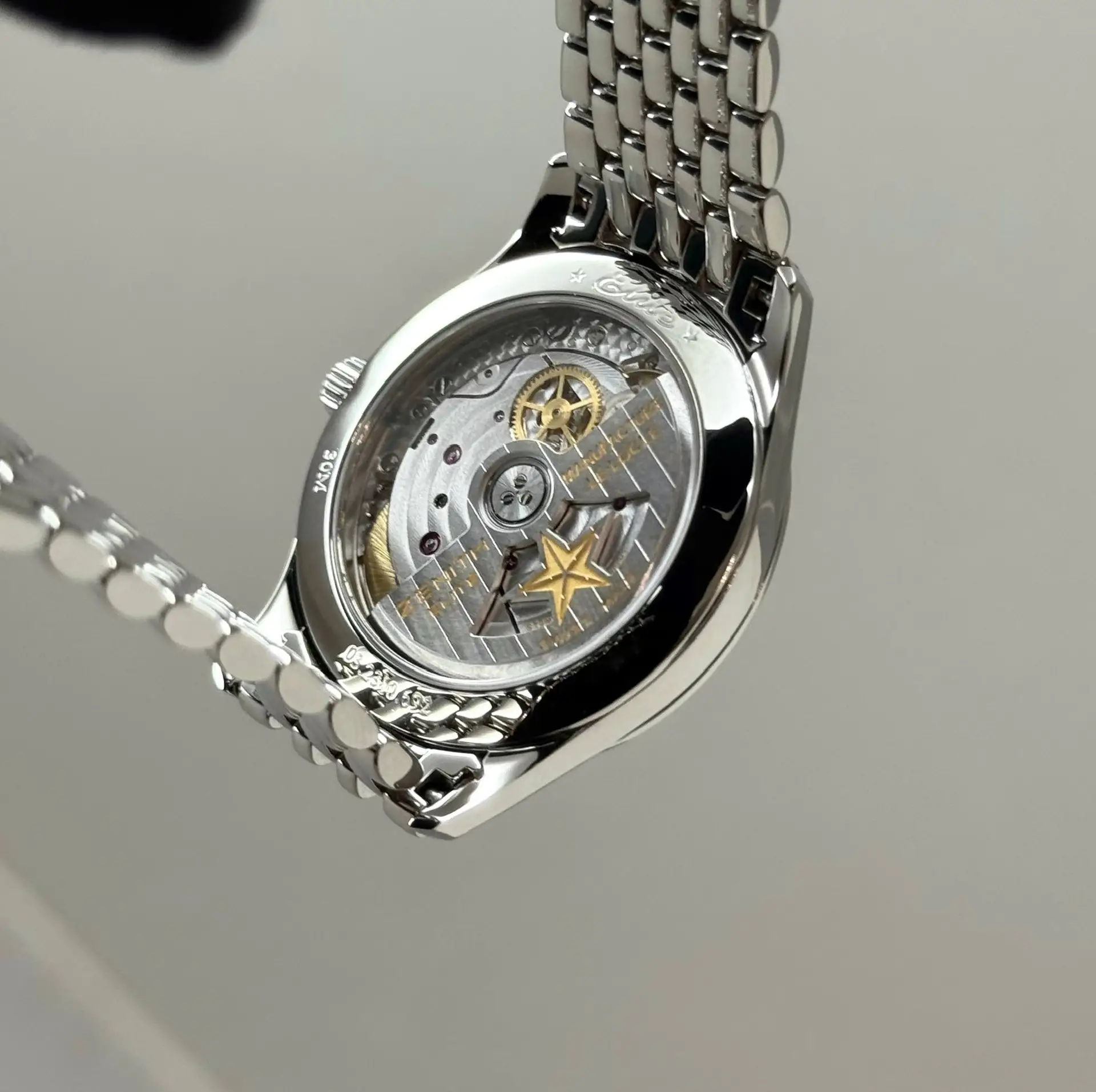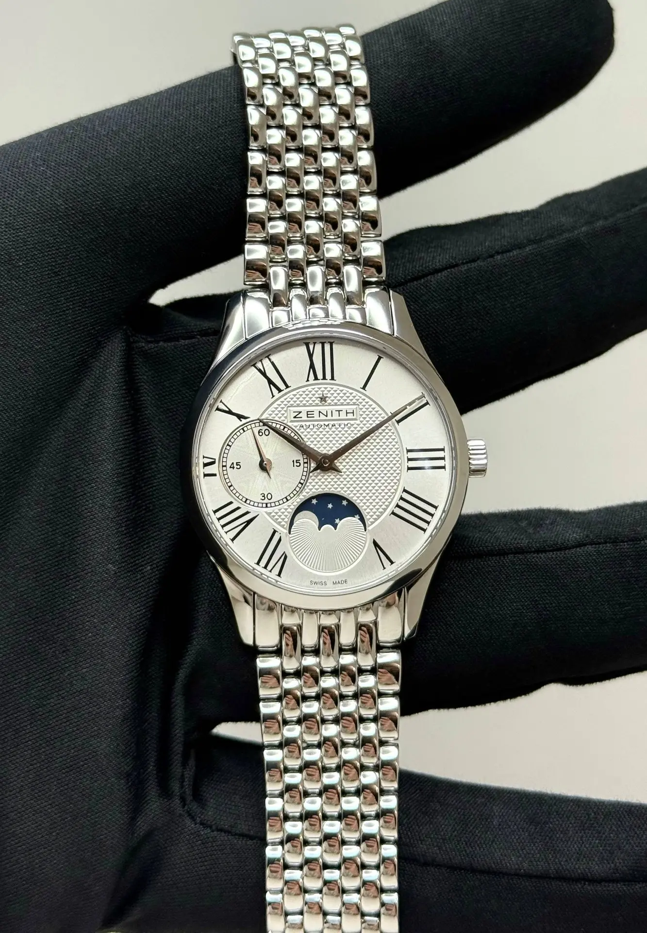 Бренд: Zenith; Кому: Женские; Состояние: Как новые; Механизм: Механика с автоподзаводом; Ремешок: Сталь; Материал: Сталь; Стекло: Сапфировое; Форма: Круг; Застежка: Раскладывающаяся; Материал застежки: Сталь; Комплектация: Переноска; Водонепроницаемость : 30 м; Страна: Швейцария; Циферблат: Серебристый; Размер браслета: 15 см; Размер корпуса: 33 мм; Функции: Часы, минуты, секунды, фаза луны;